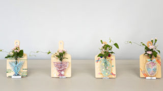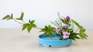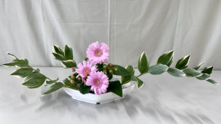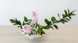 花材:丸葉ルスカス、ストック、かすみ草花型:ひらくかたち